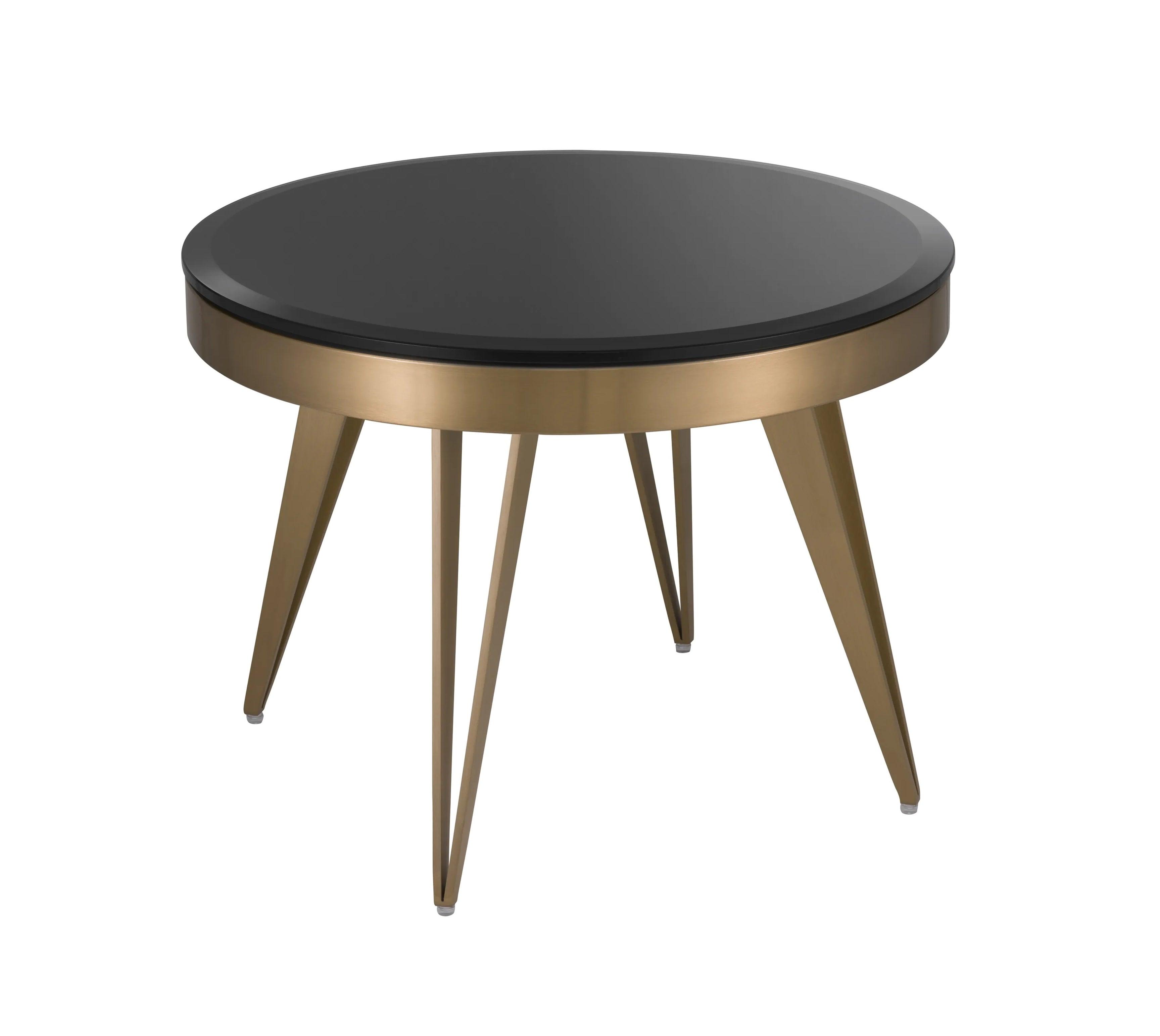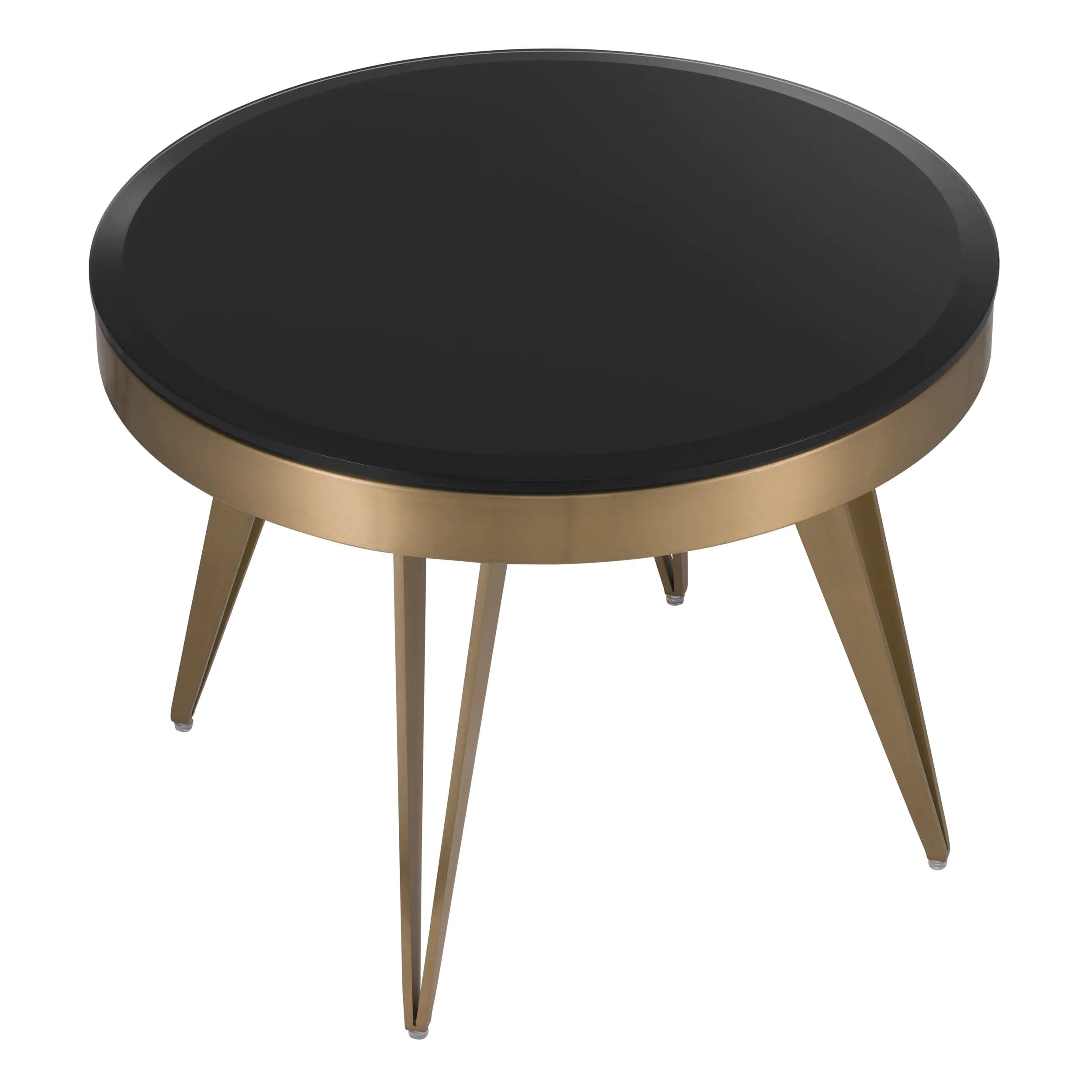 Stolik boczny Rocco to kwintesencja nowoczesnego stylu i funkcjonalności. Począwszy od trójkątnych, ażurowych nóg, których wykończenie ze szczotkowanego mosiądzu dodaje im eleganckiego blasku, a kończąc na okrągłym blacie wykonanym z fazowanego czarnego szkła - każdy detal tego stołu został starannie przemyślany, by łączyć w sobie piękno i praktyczność.