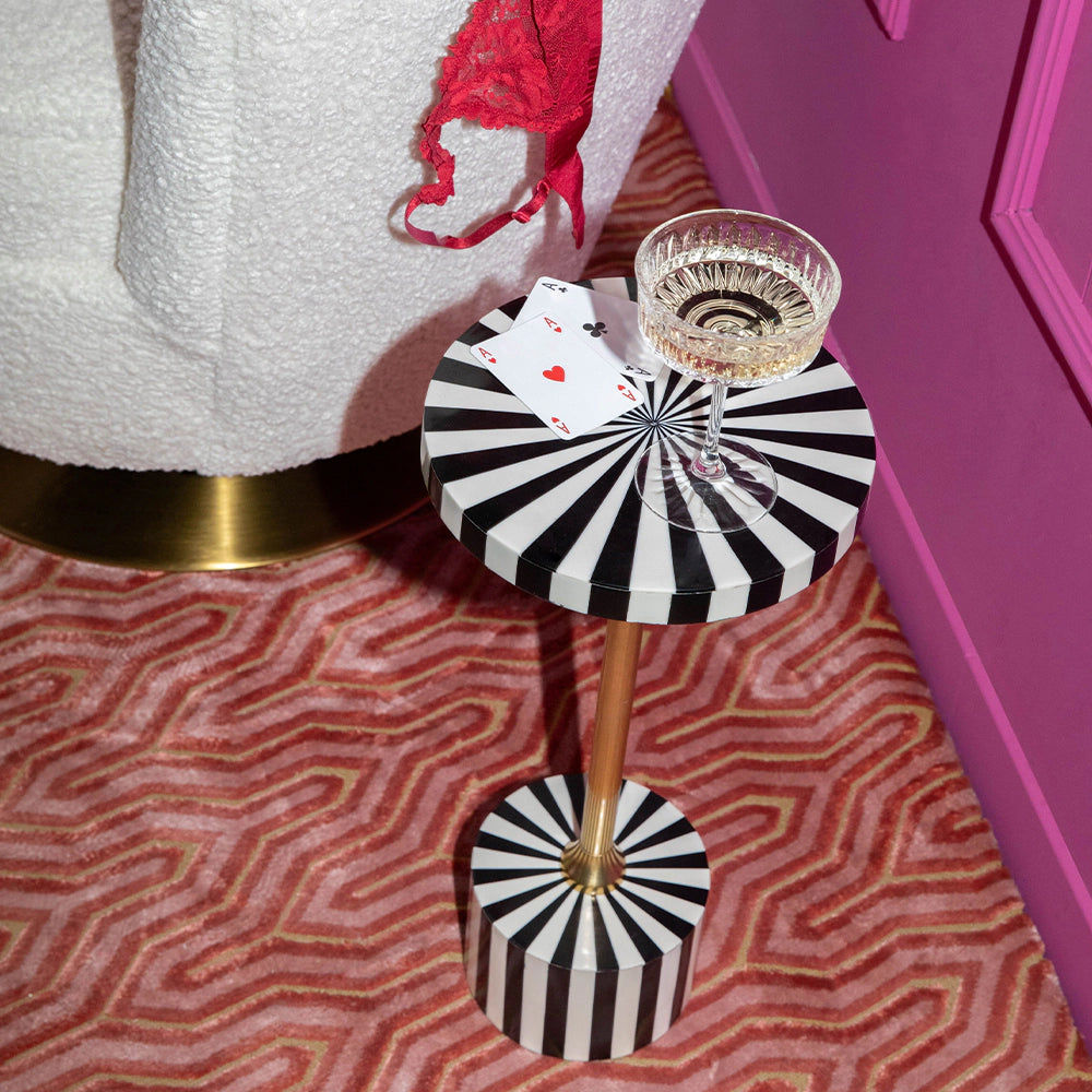 Stolik boczny Strike Lucky od Bold Monkey to designerski ukłon w stronę retro stylu z nowoczesnym twistem. Jego geometryczna forma inspirowana upadającymi kręglami symbolizuje moment triumfu – idealny talizman szczęścia w Twoim wnętrzu. Kontrastowy czarno-biały blat z żywicy oraz smukła, złocona podstawa tworzą przyciągającą wzrok kompozycję, która świetnie sprawdzi się zarówno w sypialni jako stolik nocny, jak i w salonie jako elegancki stolik pomocniczy.