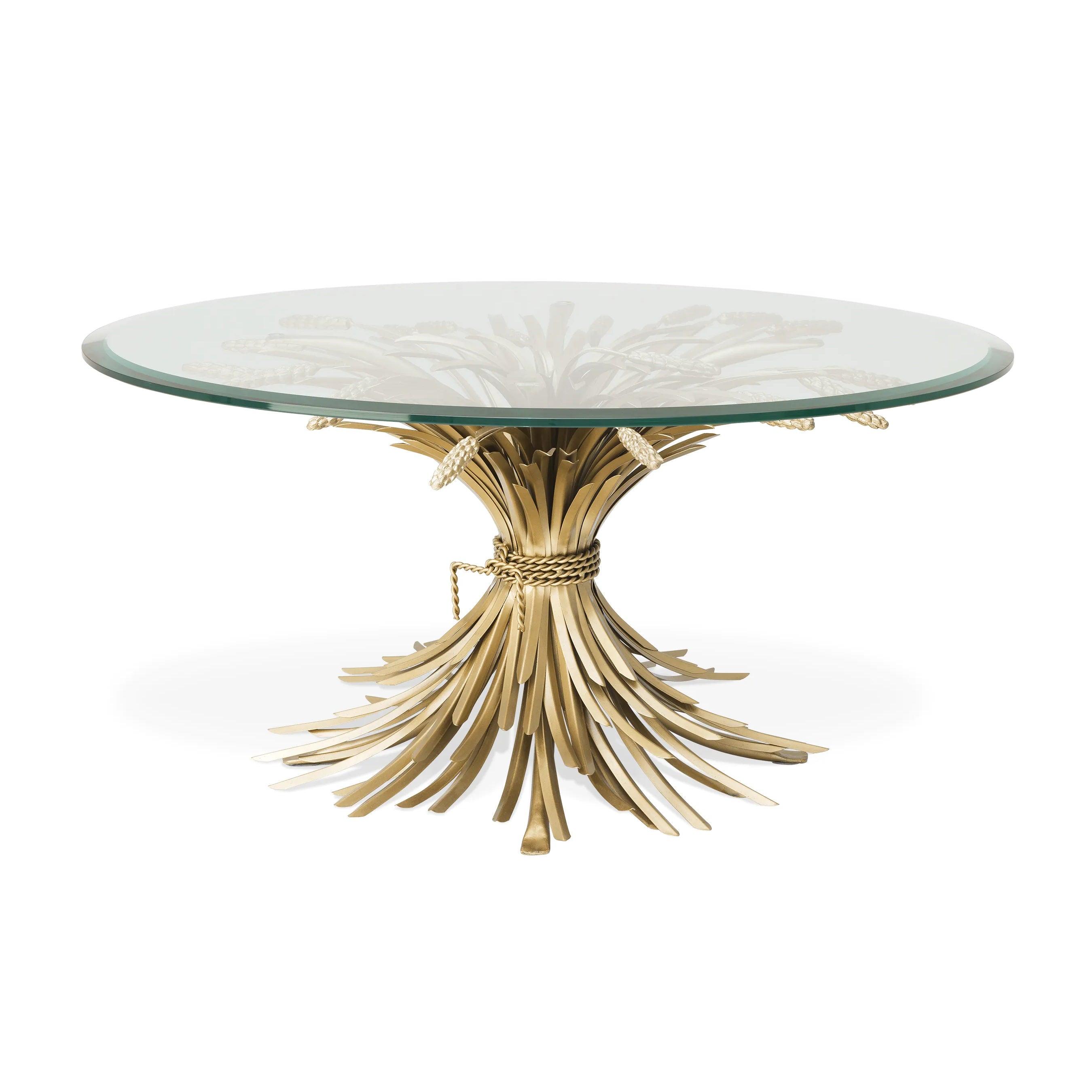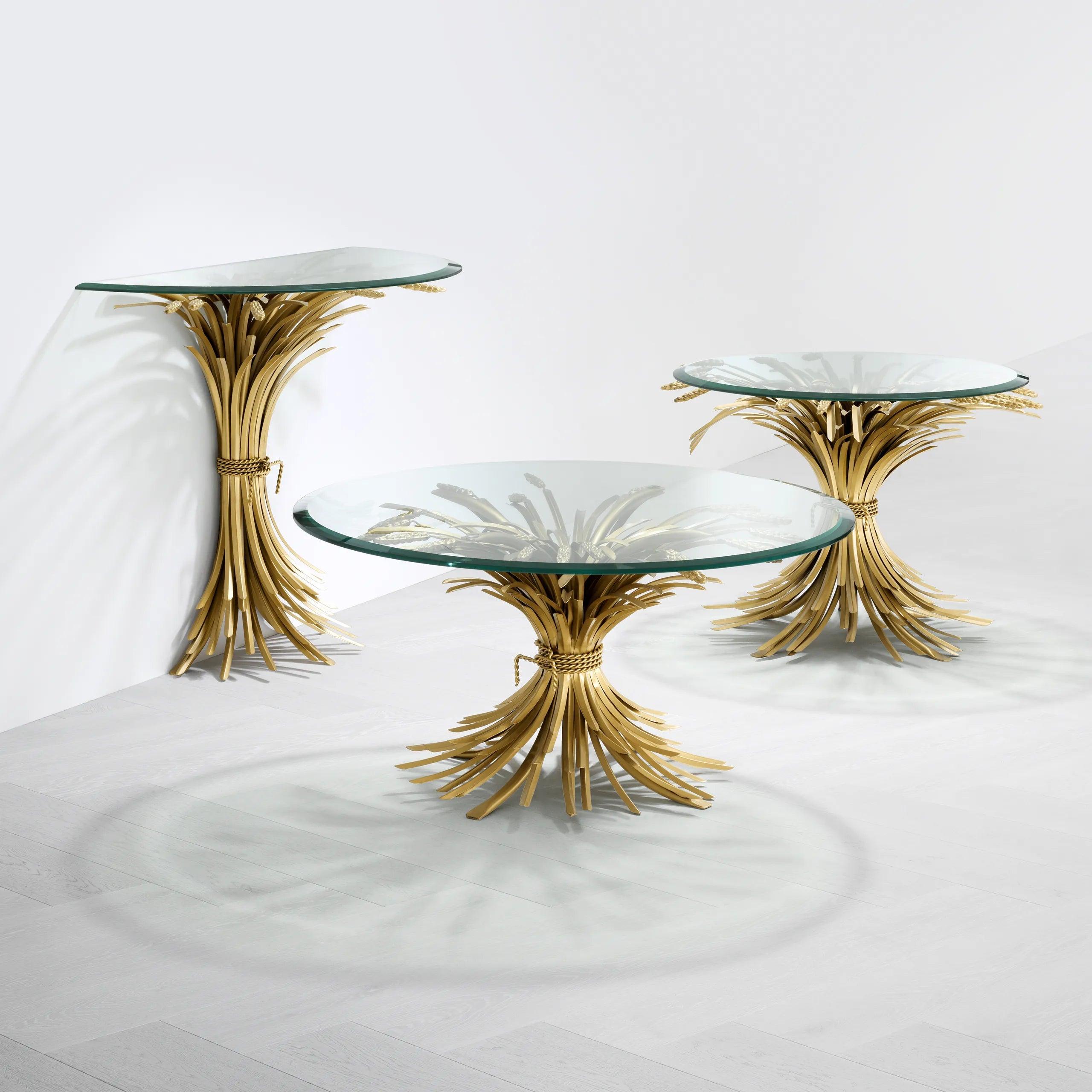 Jego podstawa, utkana w kształt snopka, wprowadza do przestrzeni nie tylko estetykę, ale także symbolikę. Snop był pierwotnie symbolem dobrobytu i gościnności, przypominając, że sukces i wygodne życie są owocem ciężkiej pracy. Ten znak odnajdujemy teraz w stoliku Bonheur, tworząc razem z nim opowieść o starannym rzemiośle i radości z efektów trudu. Fazowany blat stolika z przezroczystego szkła doskonale kontrastuje z bogactwem koloru antycznego złota. To połączenie tworzy efekt lekkości, jednocześnie umożliwiając podziwianie detali podstawy stolika. Całość emanuje wyjątkowym urokiem, wskazując na dbałość o każdy detal.