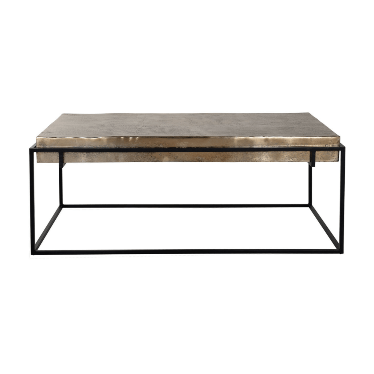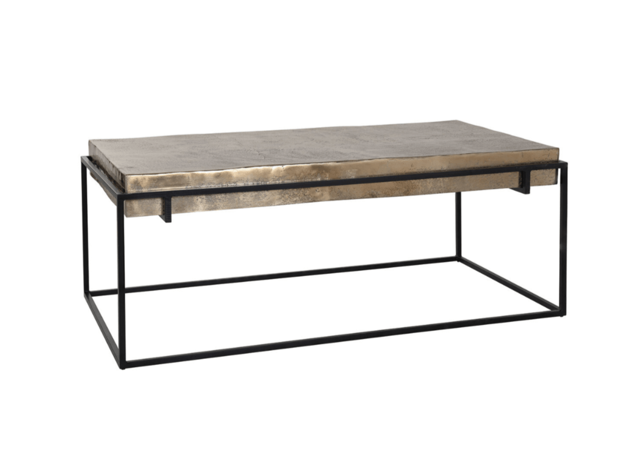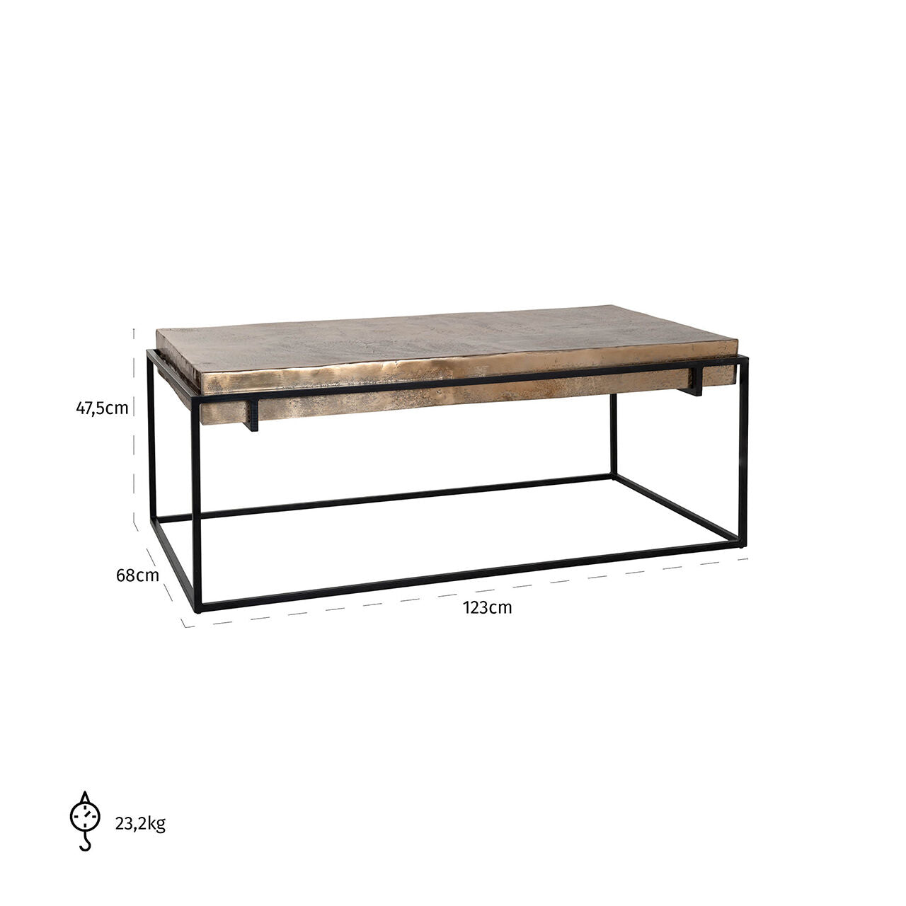 Calloway to wyjątkowy stolik kawowy, który wyróżnia się zarówno solidnością, jak i pełnym elegancji wyglądem. Wykonany jest z wyjątkowego aluminiowego blatu w pięknym odcieniu szampańskiego złota, które nadaje mu luksusowego blasku oraz wyjątkowego wyglądu. Blat ten harmonijnie łączy się z ramą wykonaną z czarnego metalu, tworząc kontrastującą i solidną strukturę.