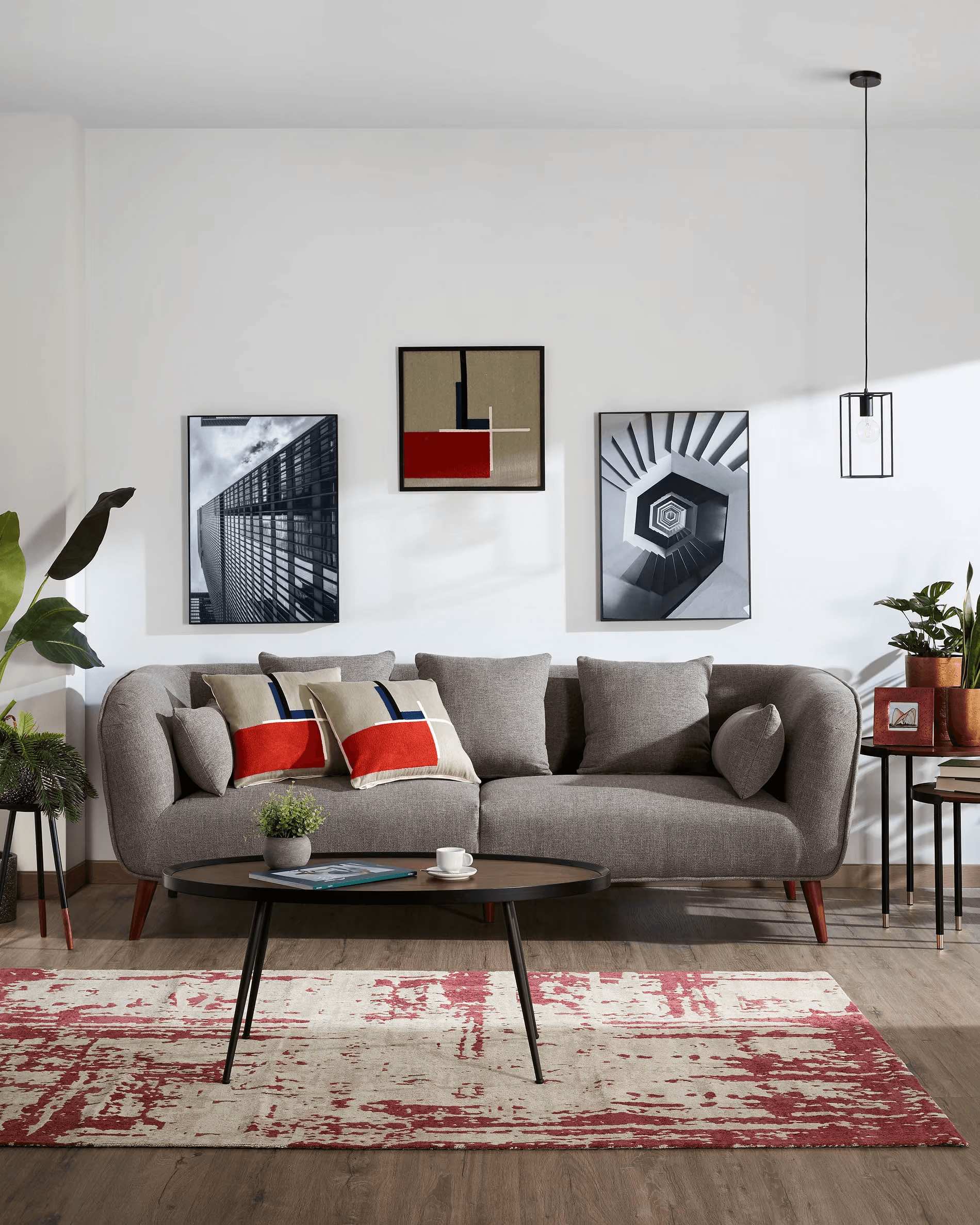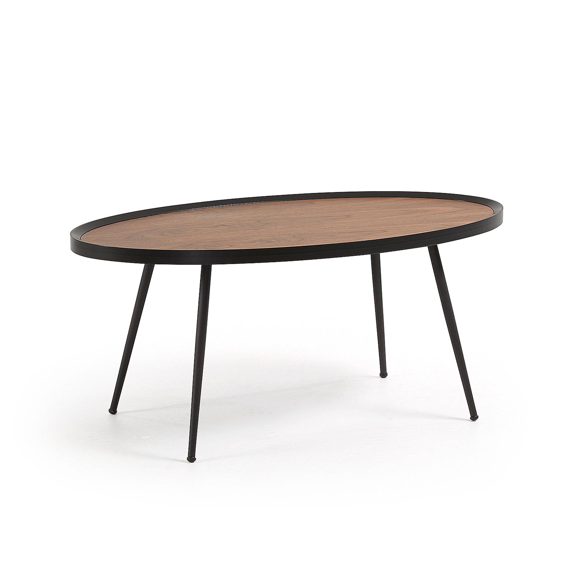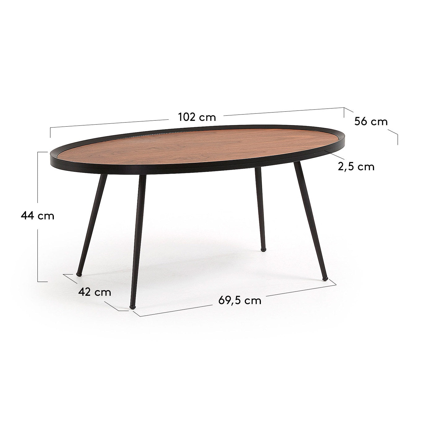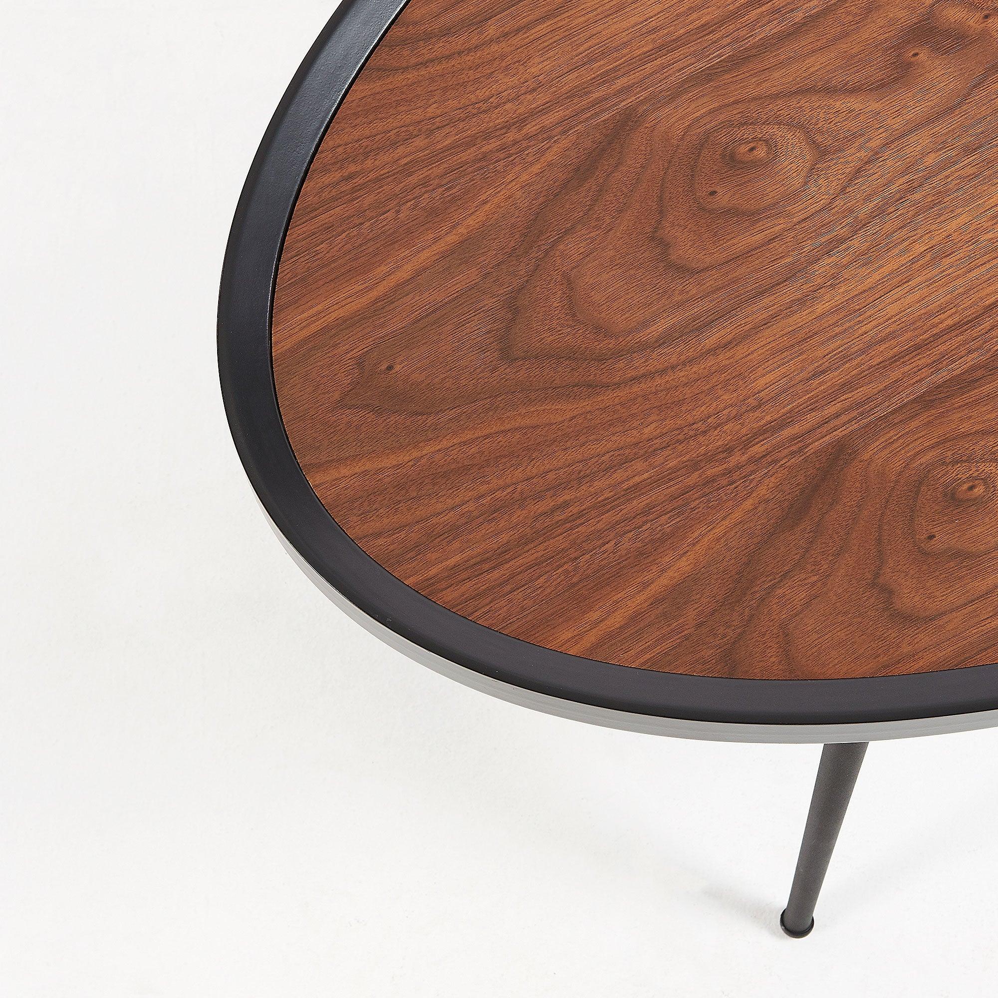 Blat stolika wykonany z forniru orzechowego wprowadza do pomieszczenia ciepło i naturalny urok, jednocześnie dodając elegancji i luksusu. Metalowa konstrukcja nadaje mu nowoczesny wygląd, tworząc efektowne połączenie surowych i delikatnych elementów.