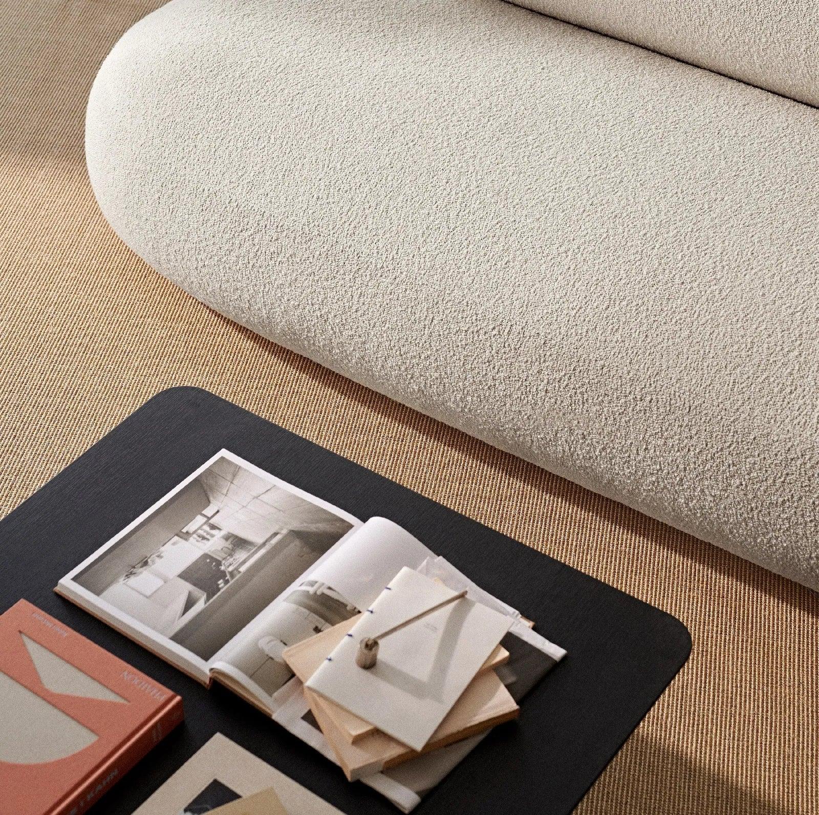 Blat stołu Oku wykonany jest z forniru dębowego z zaokrąglonymi krawędziami, co dodaje wyrafinowanego detalu dużej powierzchni. Nogi z drewna dębowego są rozmieszczone sporadycznie, aby stworzyć iluzję pływającego blatu, jednocześnie dodając rzeźbiarskie detale do stołu.