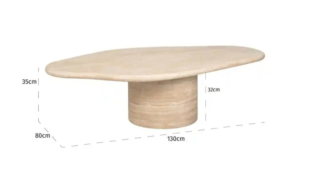 Elegancki stolik kawowy Fictus o nieregularnym blacie to propozycja dla osób poszukujących wyjątkowych mebli, które wprowadzą do wnętrza nowoczesny charakter. Połączenie imitacji trawertynu, żelaza i płyty MDF sprawia, że mebel jest jednocześnie solidny i efektowny. Delikatnie zaokrąglone krawędzie blatu nadają mu organicznej lekkości, a cylindryczna podstawa wprowadza element minimalistycznej geometrii.