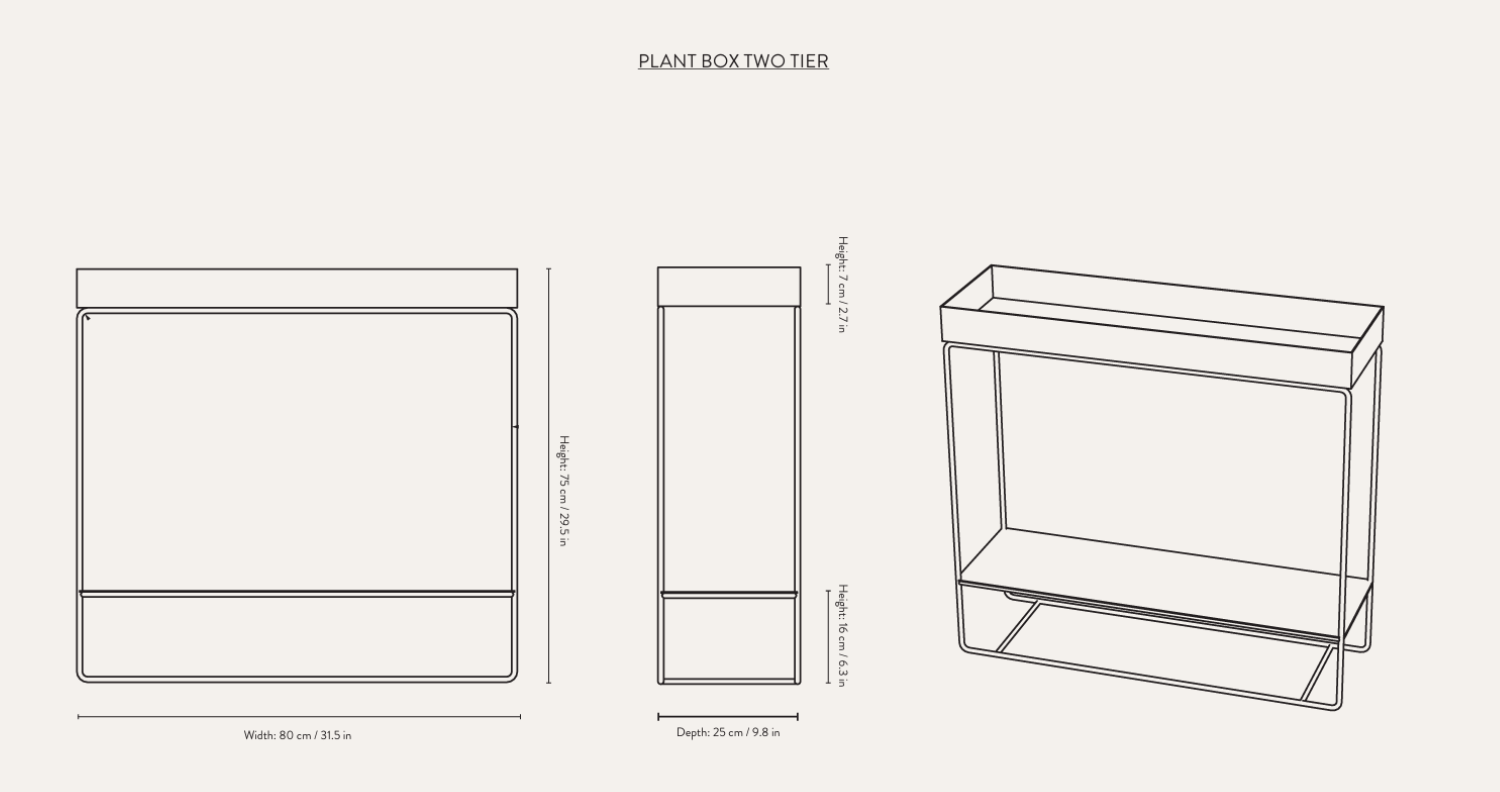 Zainspirowana popularnym modelem Plant Box, ta konsola o dwóch poziomach w kolorze czerni wprowadza nową jakość do przestrzeni. Z zachowaniem tych samych eleganckich linii, które rozpoznać można w całej serii, nowa konfiguracja oferuje przestronny górny pojemnik i dolną półkę, które doskonale nadają się do przechowywania i eksponowania dekoracyjnych akcesoriów oraz praktycznych przedmiotów codziennego użytku, takich jak filiżanki, talerze czy butelki. Smukła sylwetka sprawia, że stolik idealnie wpasuje się w większość przestrzeni, stanowiąc świetne rozwiązanie zarówno na rośliny doniczkowe w domu, jak i na balkonową przestrzeń do przechowywania.