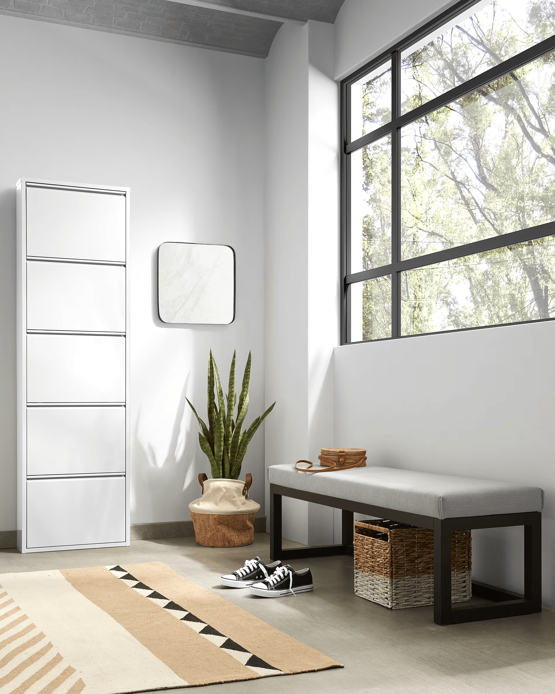 Projekt szafki na buty Ode wyróżnia się czystymi, prostymi liniami, co nadaje mu nowoczesny charakter. Biały kolor regału nadaje mu uniwersalności, umożliwiając łatwe dopasowanie do różnych stylów wnętrz.