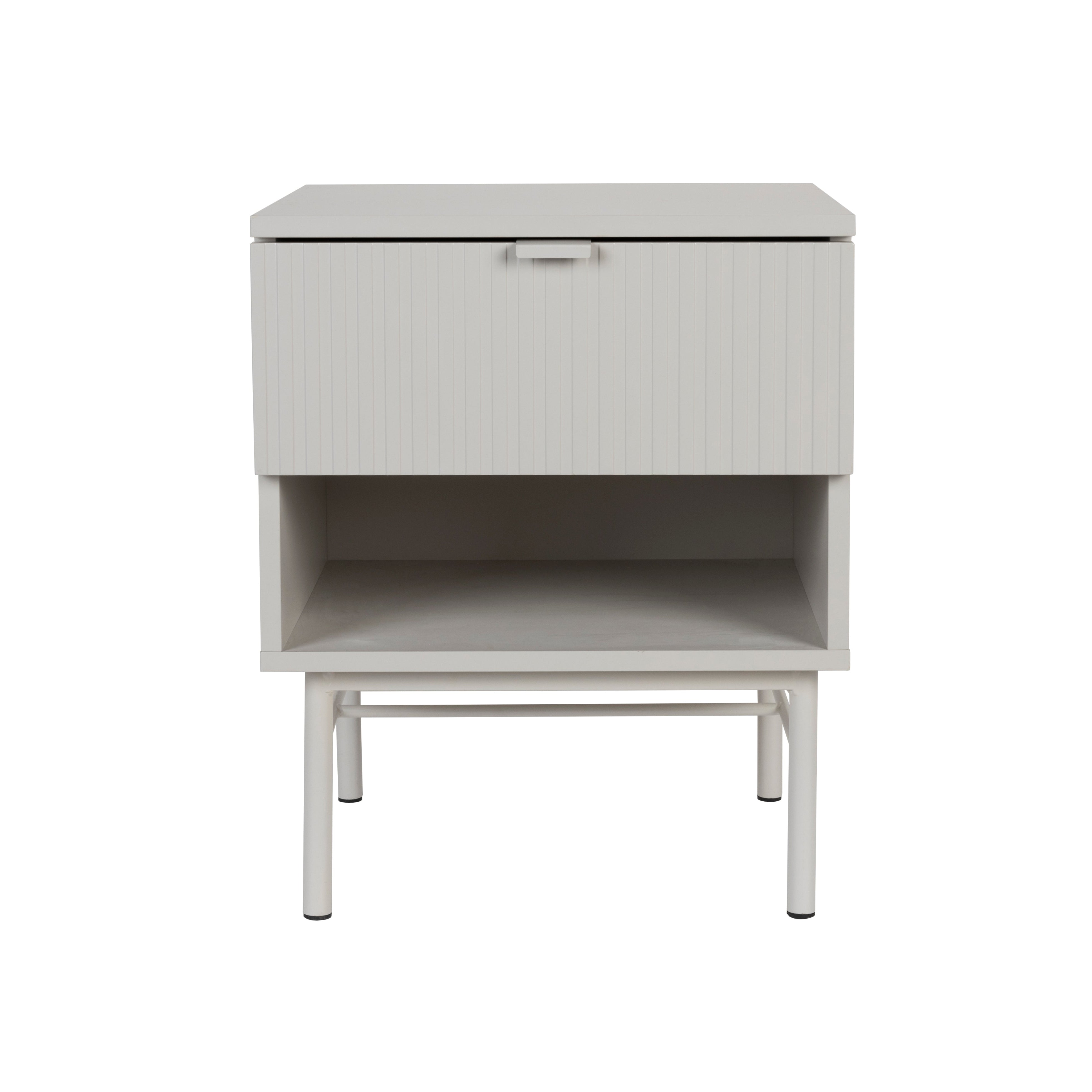 Nowoczesna szafka nocna Cayo w beżowym kolorze to elegancki i funkcjonalny dodatek do każdej sypialni. Jej minimalistyczny design z subtelnymi pionowymi frezowaniami na froncie szuflady dodaje wnętrzu lekkości i stylowego charakteru. Praktyczna szuflada zapewnia miejsce na drobiazgi, a otwarta półka umożliwia wygodne przechowywanie książek lub dekoracji. Stabilna metalowa podstawa w beżowym odcieniu pięknie komponuje się z gładkim wykończeniem korpusu, tworząc harmonijną całość.