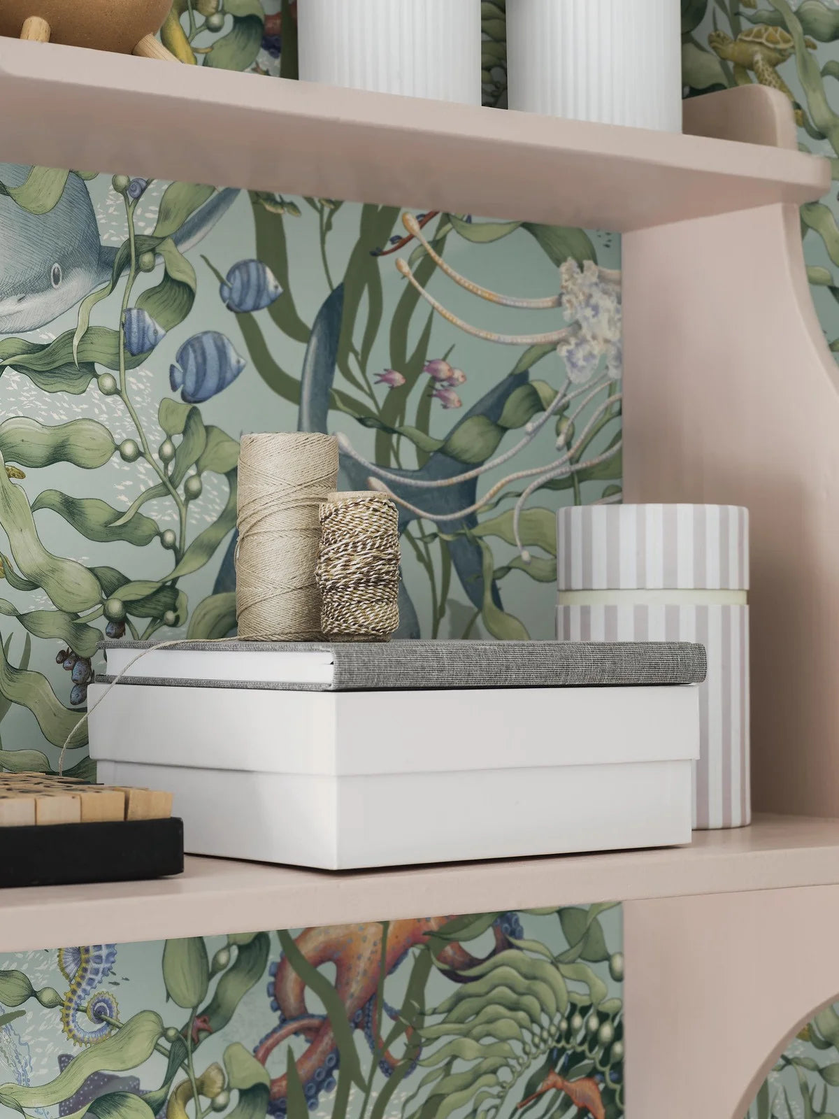 Tapeta Underwater Magic przenosi do spokojnego i tajemniczego świata podwodnych głębin, tworząc kojącą i wciągającą atmosferę. Delikatny motyw falujących wodorostów odsłania ukryte morskie stworzenia, takie jak koniki morskie i rekiny rafowe, pobudzając wyobraźnię i ciekawość dziecka. Tapeta zachwyca subtelnym wzorem inspirowanym naturą i pozwala stworzyć harmonijną przestrzeń sprzyjającą wyciszeniu.