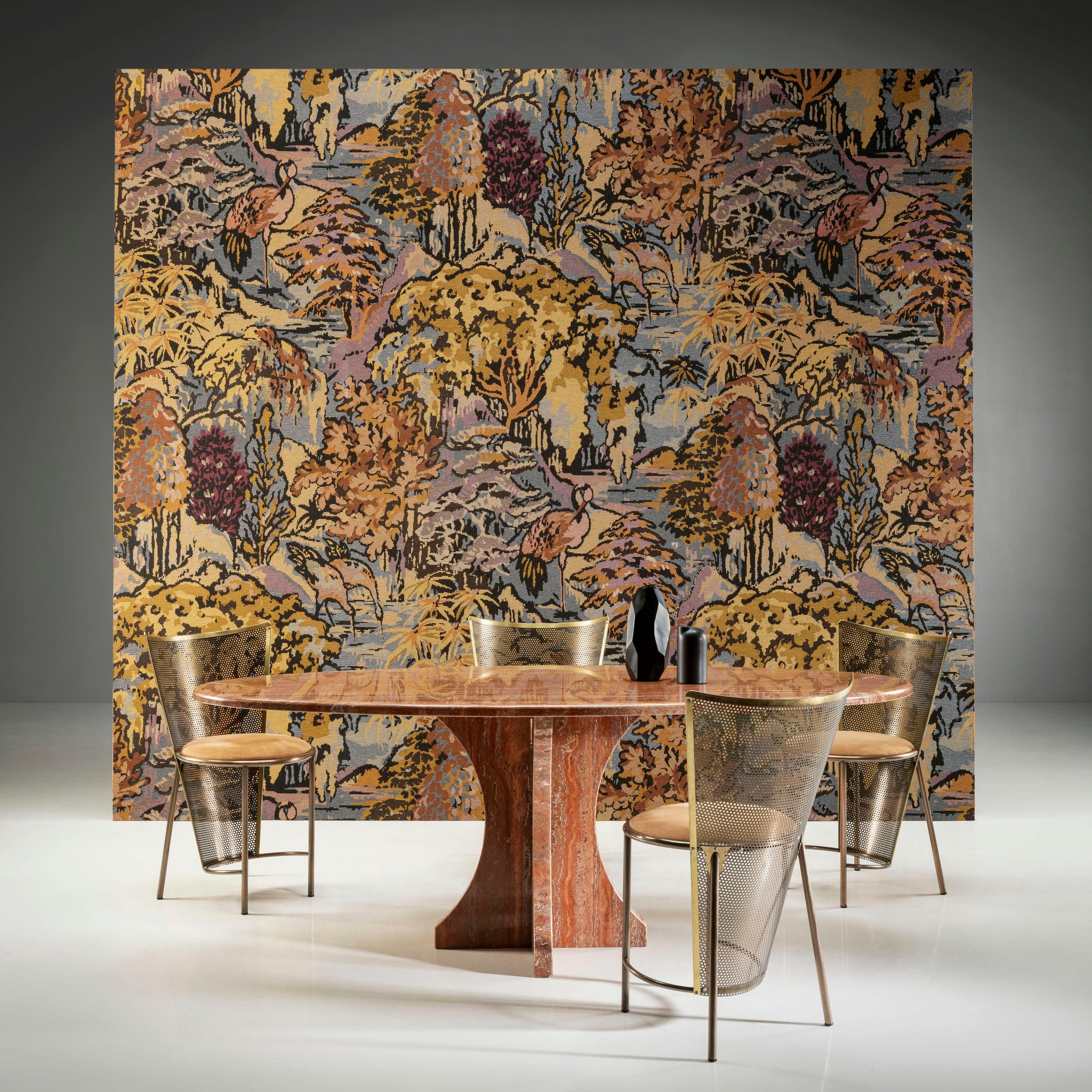 Zainspirowana klasycznymi gobelinami, ta tkana tapeta żakardowa przedstawia bujny brzeg rzeki z japońskim żurawiem wyłaniającym się z roślinności. Ta unikalna tapeta symbolizuje szczęście i długowieczność w Japonii. Rysunek jest celowo pikselowany, nawiązując do optymizmu lat pięćdziesiątych XX wieku w tym kraju.