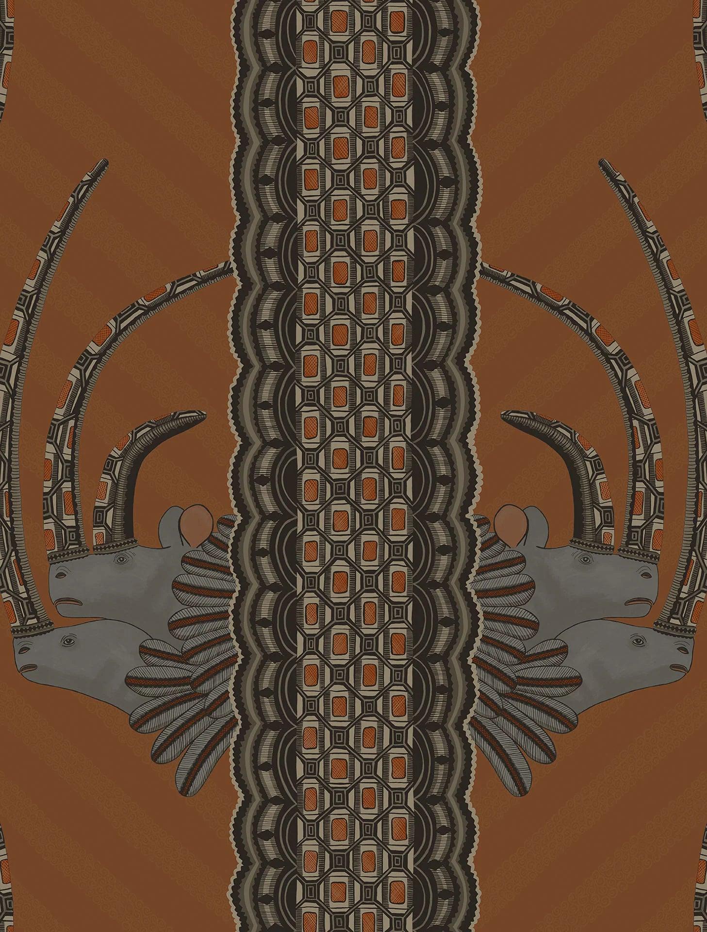 Ozdobna tapeta zawiera w sobie prawdziwego ducha afrykańskiej kultury. Motyw zawiera prawdziwego afrykańskiego ducha ze wzorem przypominającym kosze Zulu, z którego wyłania się para królewskich białych nosorożców z ozdobnymi rogami.