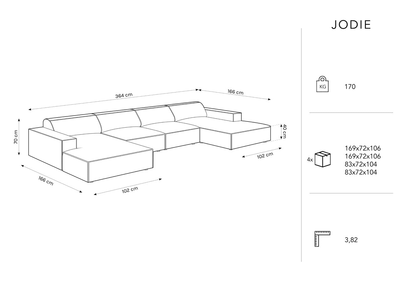 Jodie Sofa panoramiczna jest bardzo wygodna dzięki swojemu dużemu rozmiarowi, który umożliwia siedzenie na niej nawet sześciu osobom. Dodatkowo posiada miękkie, wygodne poduszki oparciowe i siedziska, które zapewniają komfort podczas użytkowania.
