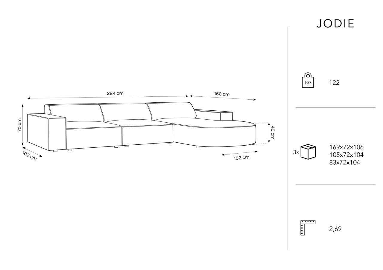 Jodie to wygodna sofa narożna z miejscem dla czterech osób, idealna do przestrzeni wypoczynkowej. Sofa ta posiada elegancki i nowoczesny design, który wprowadzi do Twojego wnętrza styl i harmonię.