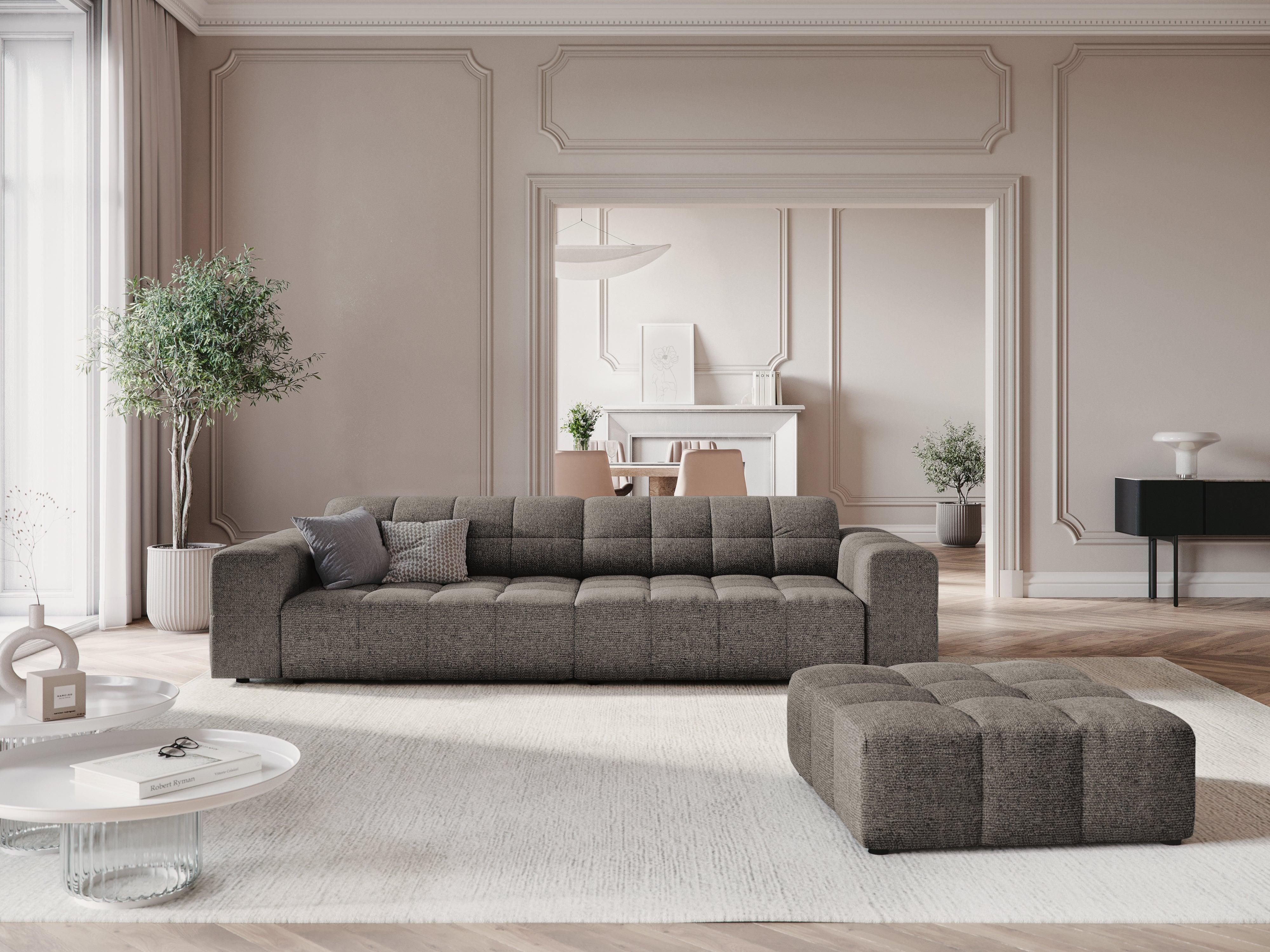 Szenilowa tkanina o jedwabistej powierzchni ma formę wyrazistego splotu o lekko opalizującej powierzchni. Tapicerkę podzielono na duże, wypukłe kwadraty, dodaje sofom przytulnego i zachęcającego charakteru. Nie można przejść obojętnie obok starannie profilowanych podłokietników, które w połączeniu z oparciami tworzą spójne wsparcie dla pleców i ramion, zapewniając przyjemne doznania podczas korzystania z mebli.