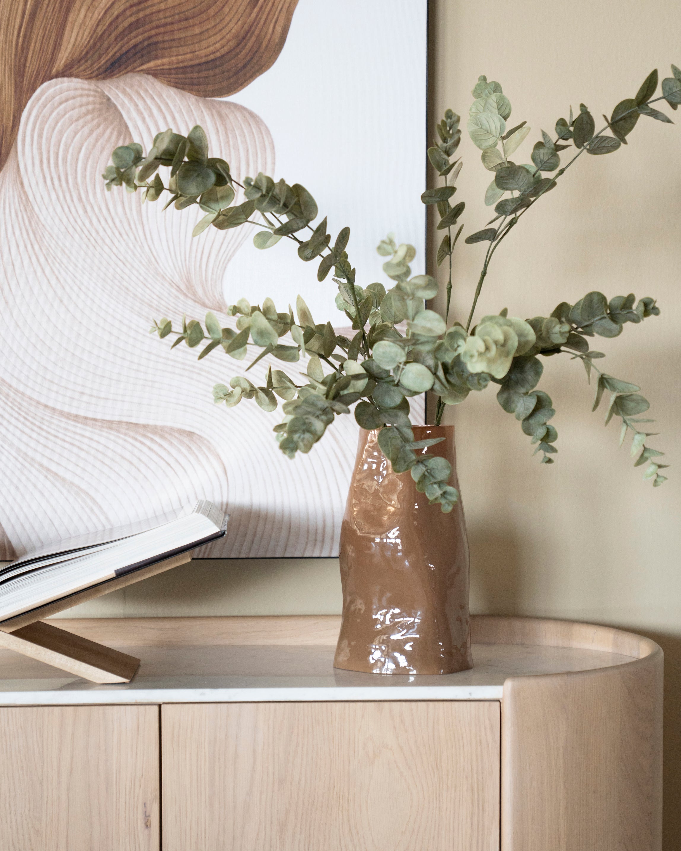 Wazon Boyna to połączenie minimalistycznej formy i organicznej lekkości. Jego nieregularny, subtelnie falujący kształt przypomina ręcznie modelowaną ceramikę, jednak wykonany został z dmuchanego szkła, które nadaje mu elegancji i nowoczesnego charakteru. Matowa, mleczna kolorystyka sprawia, że Boyna doskonale komponuje się z wnętrzami w stylu skandynawskim, naturalnym, japandi czy modern organic. Wazon pięknie prezentuje się solo jako dekoracja, ale równie dobrze współgra z bukietami suszonych traw lub pojedynczymi gałązkami.