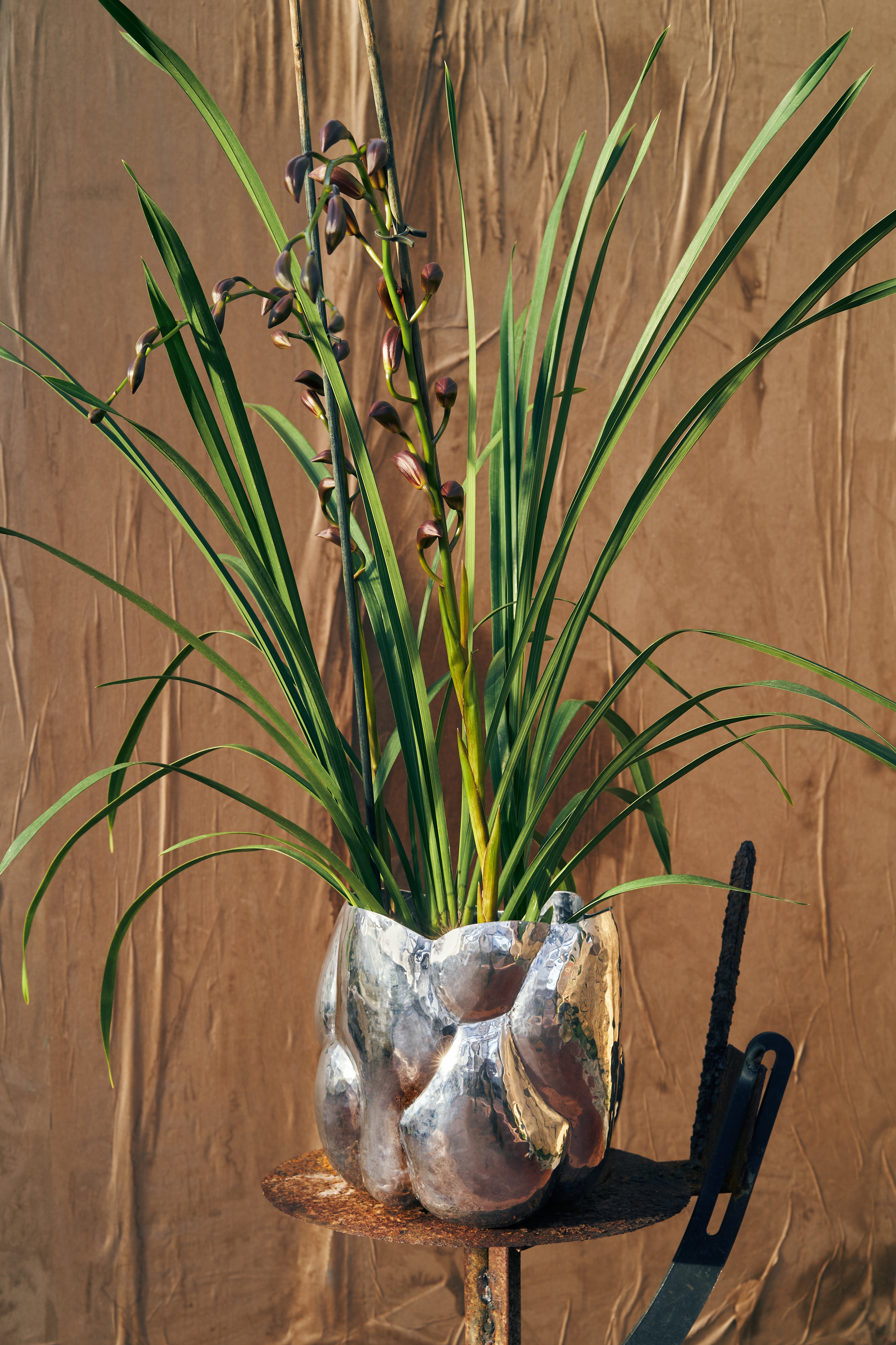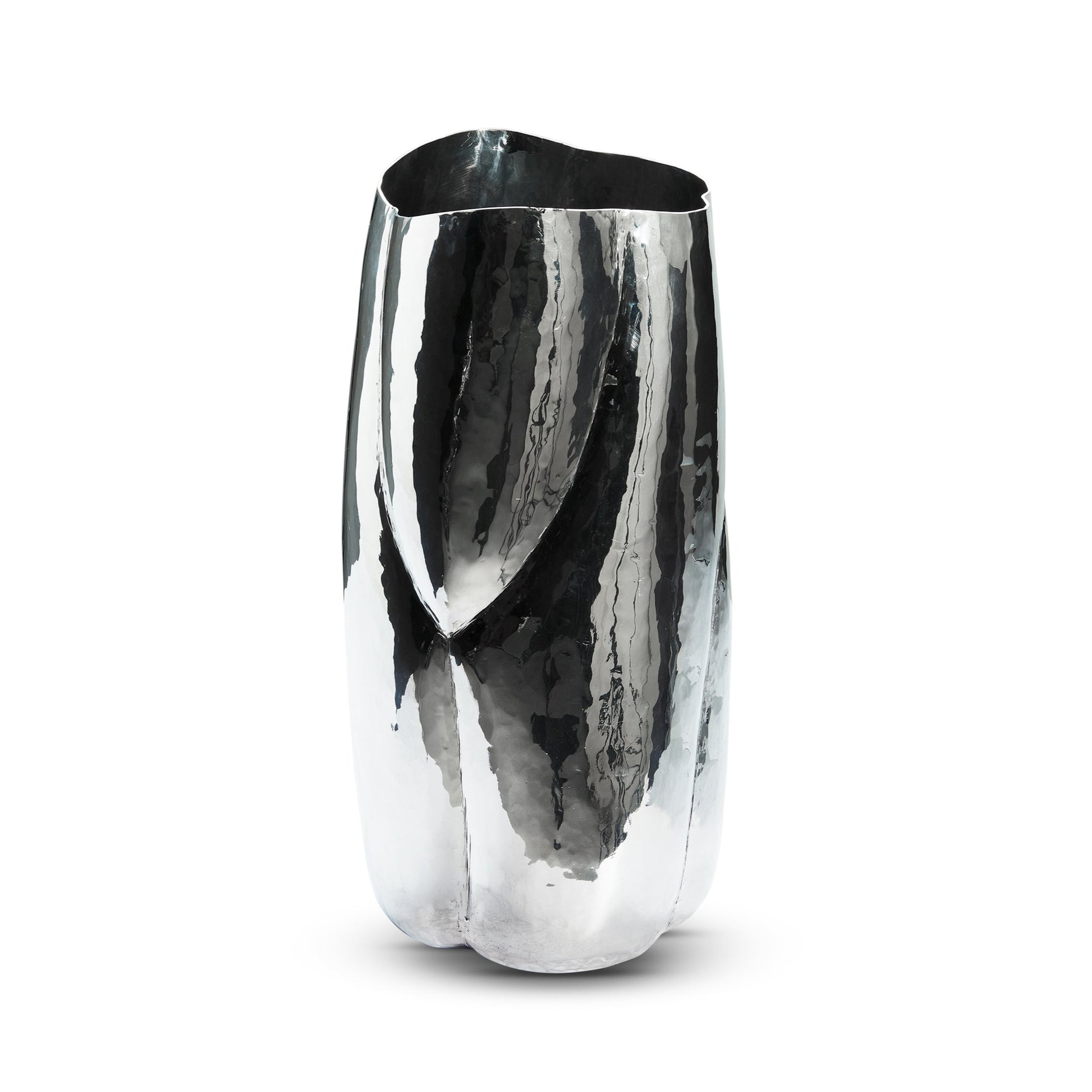Cloud to rzeźbiarski, wazon wykonany z wysoko polerowanego aluminium o lustrzanym wykończeniu. Każdy egzemplarz jest ręcznie tworzony przez wykwalifikowanych rzemieślników w Indiach, dzięki czemu każdy posiada unikalne cechy. Ślady młotkowania, subtelne odkształcenia i delikatne spawy podkreślają ręczne wykonanie i dodają mu artystycznego charakteru.