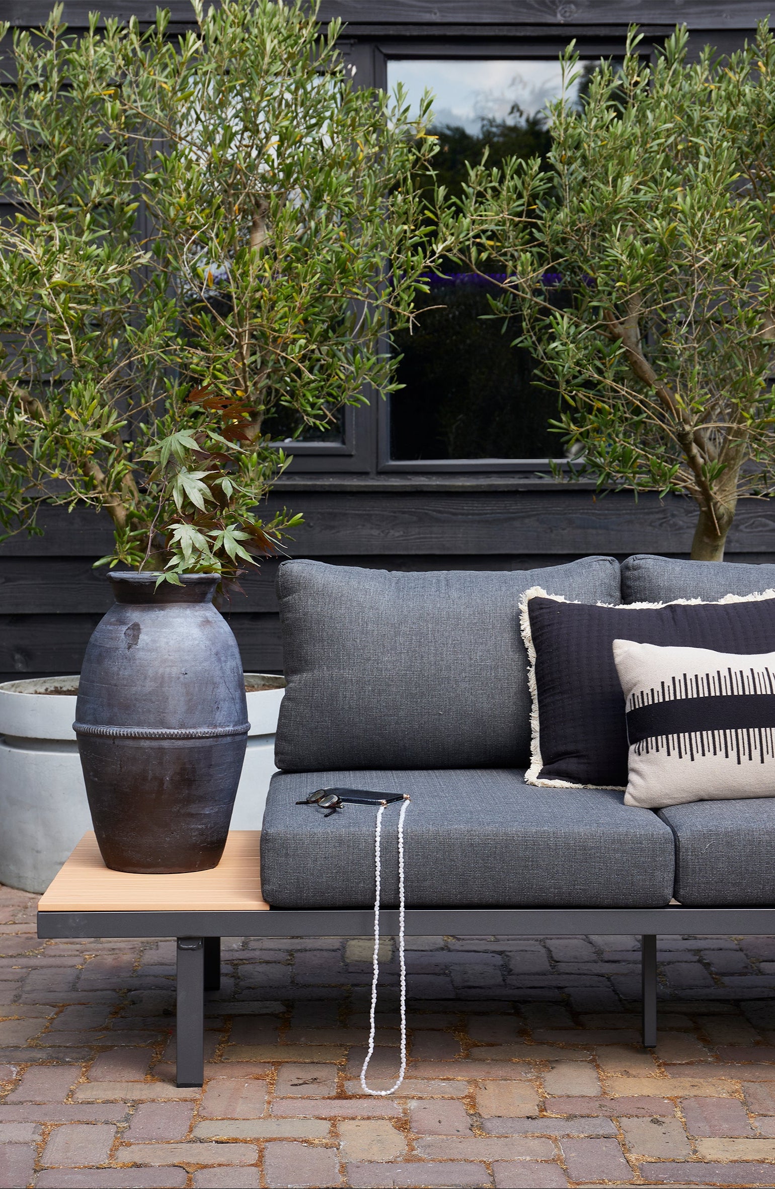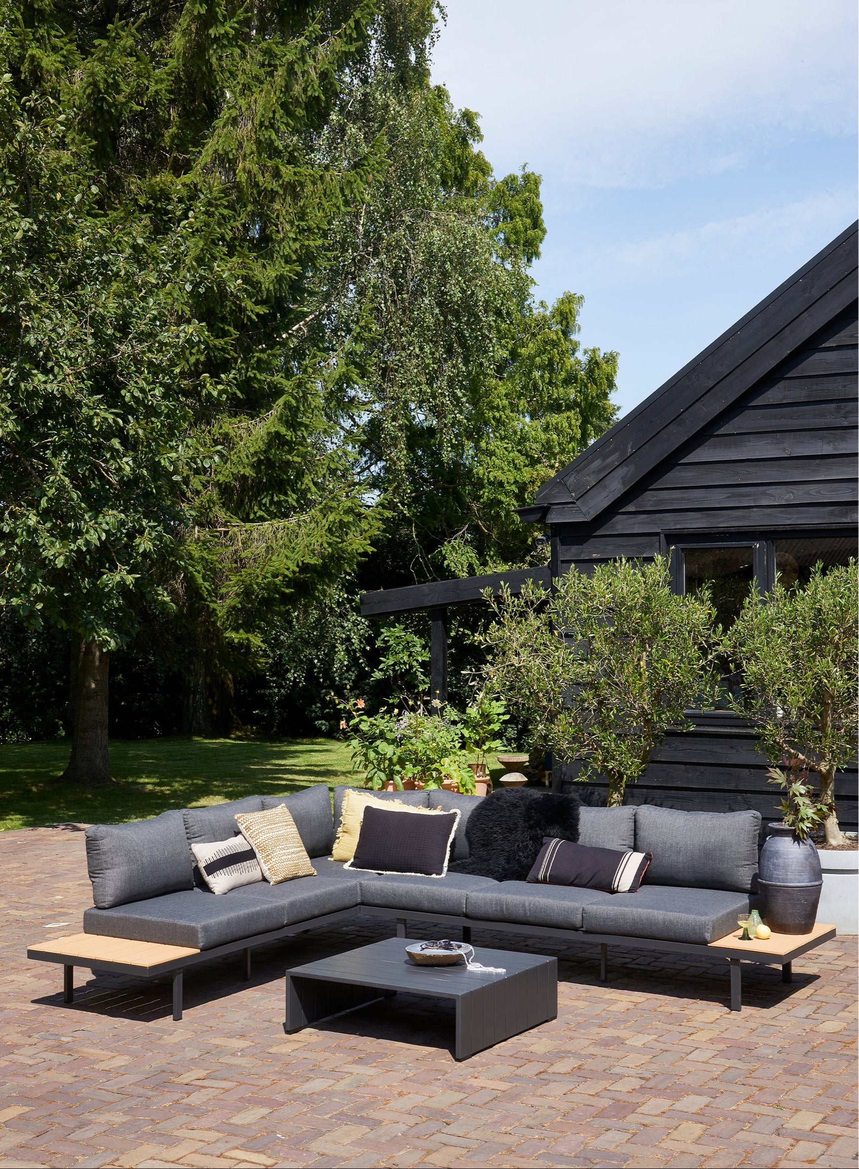 Bari to przestronny i stylowy zestaw wypoczynkowy do ogrodu, który doskonale sprawdzi się podczas letniego relaksu na tarasie czy werandzie. Narożna sofa z dopasowanym stolikiem kawowym została wykonana z trwałego polimateriału o wyglądzie drewna (polywood) i aluminiowej ramy w kolorze antracytowym. Całość uzupełniają komfortowe poduszki w odcieniu ciemnej szarości.
