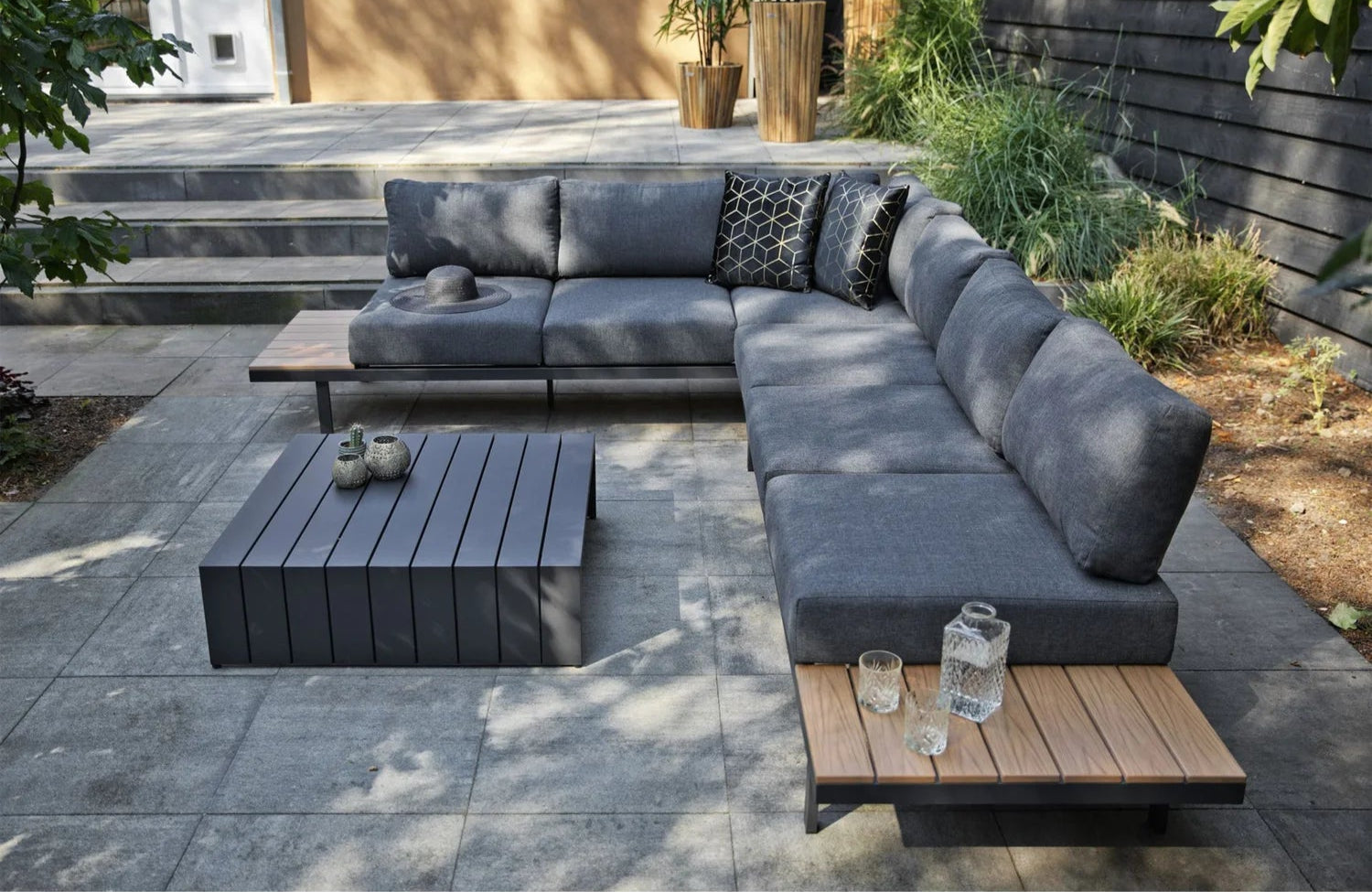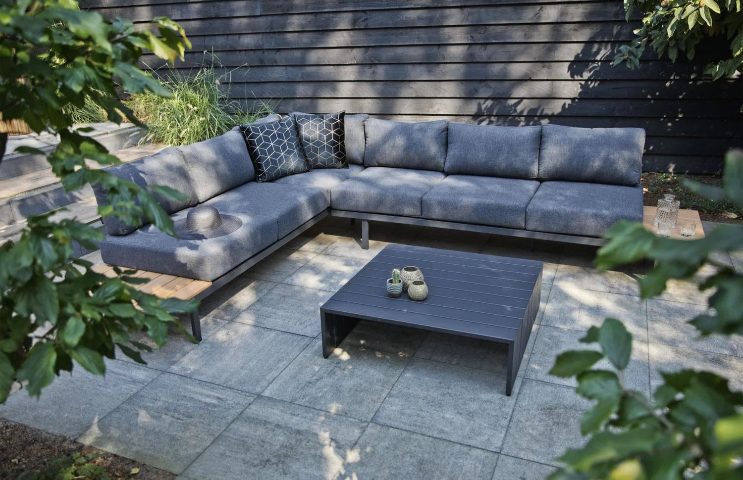 przestronna narożna sofa ogrodowa z dopasowanym stolikiem kawowym